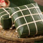 This dish is made from glutinous rice, mung beans, pork, and other ingredients. The ingredients are wrapped tightly in banana leaves and then boiled or steamed for many hours. The result is a dense, square-shaped cake with a distinct aroma and flavor.